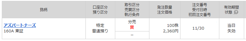 アズパートナーズ(160A)の立会外分売が本日(12月1日)実施されました。
