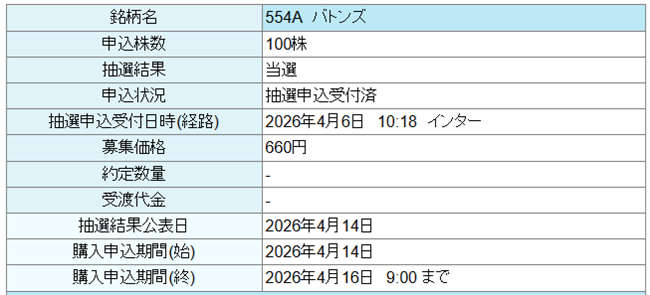 そして、私のバトンズIPOの抽選結果は以下の通りでした。