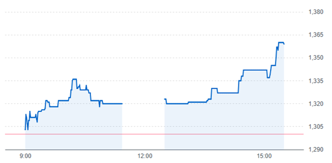 ビーブレイクシステムズは分売価格(1,261円)を上回る1,303円で始まり、大引けに向かって急伸しながら1,359円で取引を終えています。