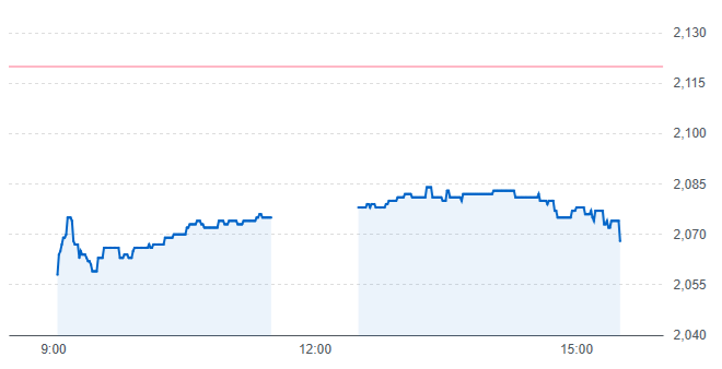 アイスコは分売価格(2,057円)と同値で始まり、少しづつ値を上げながら後場に2,084円の高値を付け、やや値を下げながら2,068円で取引を終えています。