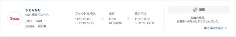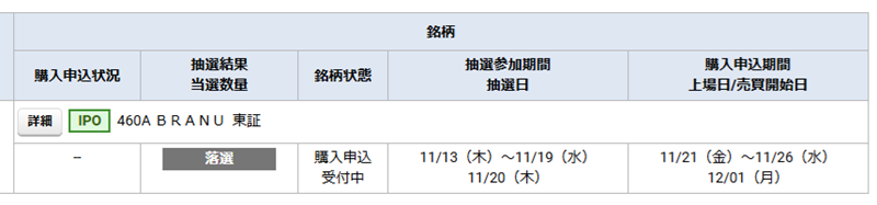 そして、私のBRANU(460A)IPOの抽選結果は以下の通りでした。