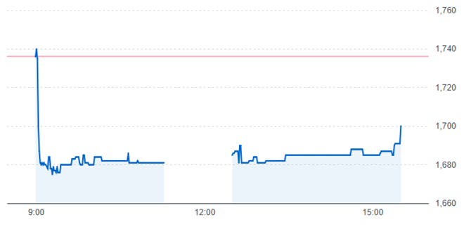 パパネッツは分売価格(1,684円)を上回る1,736円で始まりましたが一瞬で急落し、1,680円くらいで横横に推移しながら1,700円で取引きを終えています。