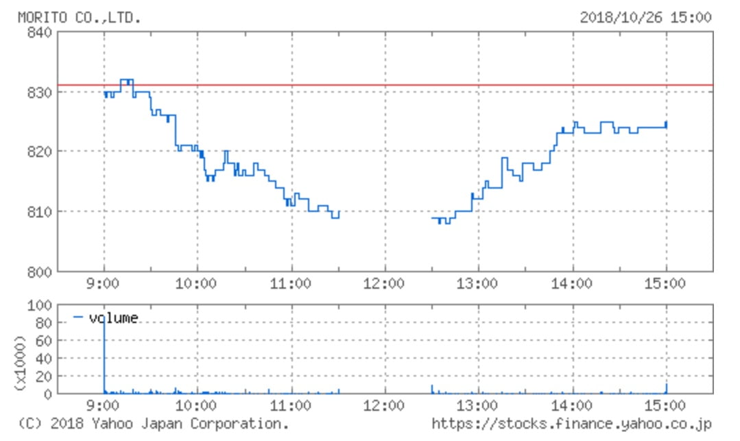 モリト(9837)は、分売価格(808円)を上回る831円で始まり、その後に分売価格と同値まで値を下げましたが、後場になって盛り返し、824円で取引を終えています。