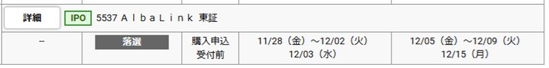 主幹事の野村證券はあっさりと落選です。また、AlbaLinkはSMBC日興証券や松井証券