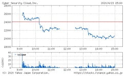 サイバーセキュリティクラウドは寄りからしばらくプラス域で推移していましたが、その後に急落すると再び浮上することはなく、前日比-3,440円の20,610円で取引きを終えています。