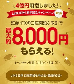 LINE証券が最大で約8,000円がもらえる1周年記念キャンペーン第一弾を実施中です。