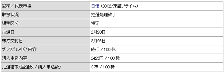 日伝(9902)POの抽選結果が発表されました。