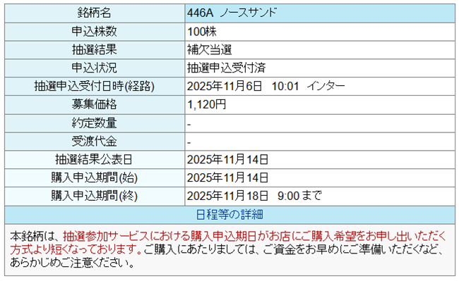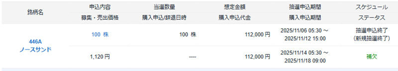 そして、私のノースサンドIPOの抽選結果は以下の通りでした。