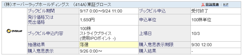 オーバーラップホールディングスIPOは検討した結果、SBI証券のIPOチャレンジポイント狙いのみとしたので、思惑通りに落選=IPOチャレンジポイントをゲットして終了です。