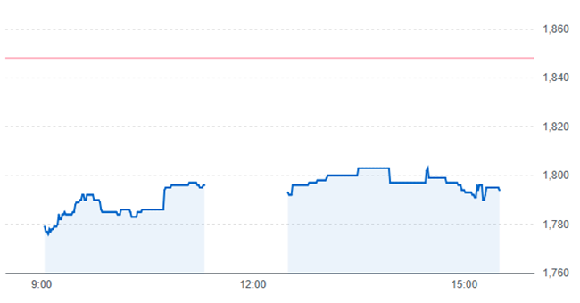 プラザホールディングスは分売価格(1,774円)をわずかに上回る1,779円で始まり、その後にやや値を上げながら後場に1,803円の高値を付け、ゆるやかに値を下げながら1,794円で取引を終えています。