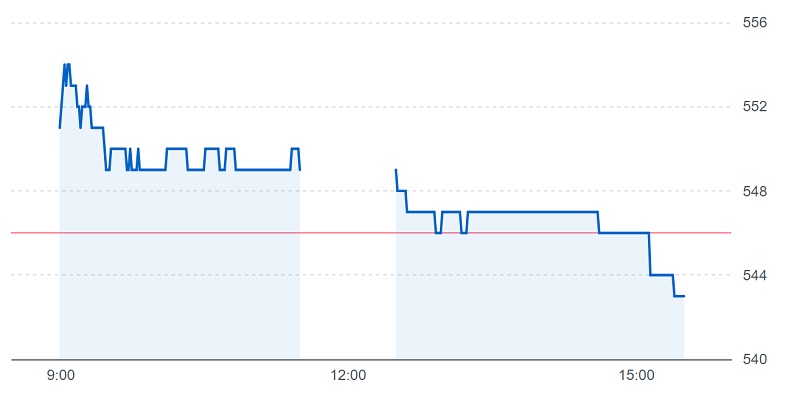 サカイホールディングスは分売価格(530円)を上回る551円で始まり、その直後に556円の高値を付けました。しかし、そこからは徐々に値を下げ、543円で取引きを終えています。