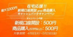 また、新規口座を開設した後、キャンペーン期間中(4月8日~5月29日)に5万円以上の商品を購入すると、さらに500円がキャッシュバックされるので、最大で1,000円のキャッシュバックを受け取ることが出来ます。