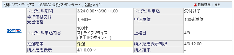 そして、私のソフトテックスIPOの抽選結果は以下の通りでした。