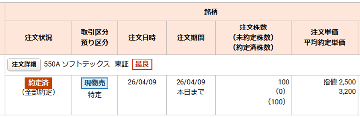 そして、私は主幹事の岡三証券で当選していた100株を2,500円の指値で売り注文を出していたため、初値での利確となりました。