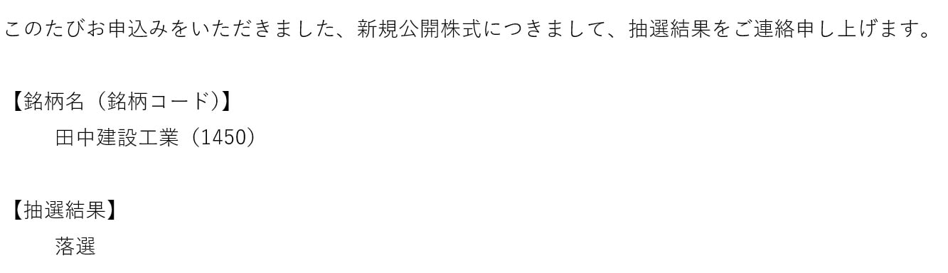 そして、私の田中建設工業IPOの抽選結果は以下の通りになっています。