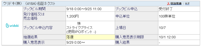 ウリドキIPOは平幹事のSBI証券にも申し込みましたが残念ながら落選でした。