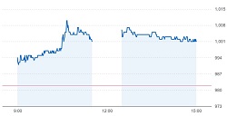 ヴィスは分売価格(963円)を大幅に上回る990円で始まり、順調に値を上げながら1,010円の高値を付け、その後も1,000円台をキープしながら1,001円で取引きを終えています。